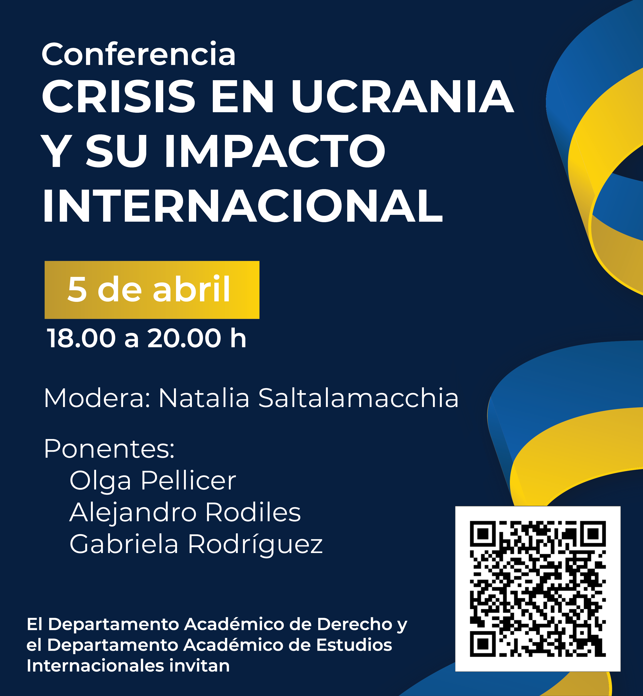 El Departamento Académico de Derecho y de Estudios Internacionales se complacen en invitarlos al webinar "Crisis en Ucrania y su Impacto Internacional", que se llevará a cabo el 5 de abril de 18:00 a 20:00 hrs.