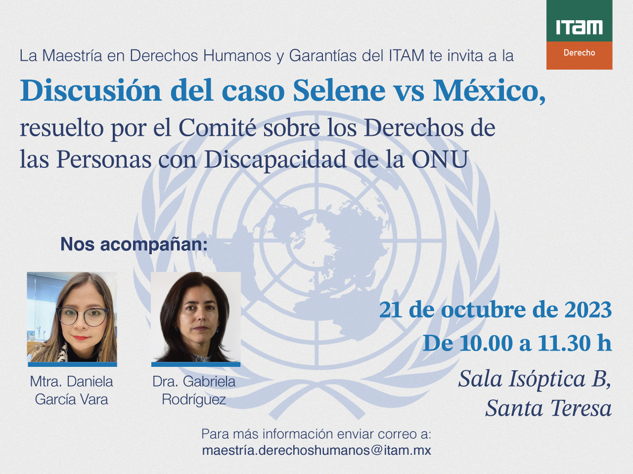 La Maestría en Derechos Humanos y Garantías del ITAM te invita a la Discusión del caso Selene vs México, resuelto por el Comité sobre los Derechos de Personas con Discapacidad de la ONU que se llevará a cabo el viernes 21 de octubre a las 10:00 hrs. en la Sala Isóptica B del campus Santa Teresa.