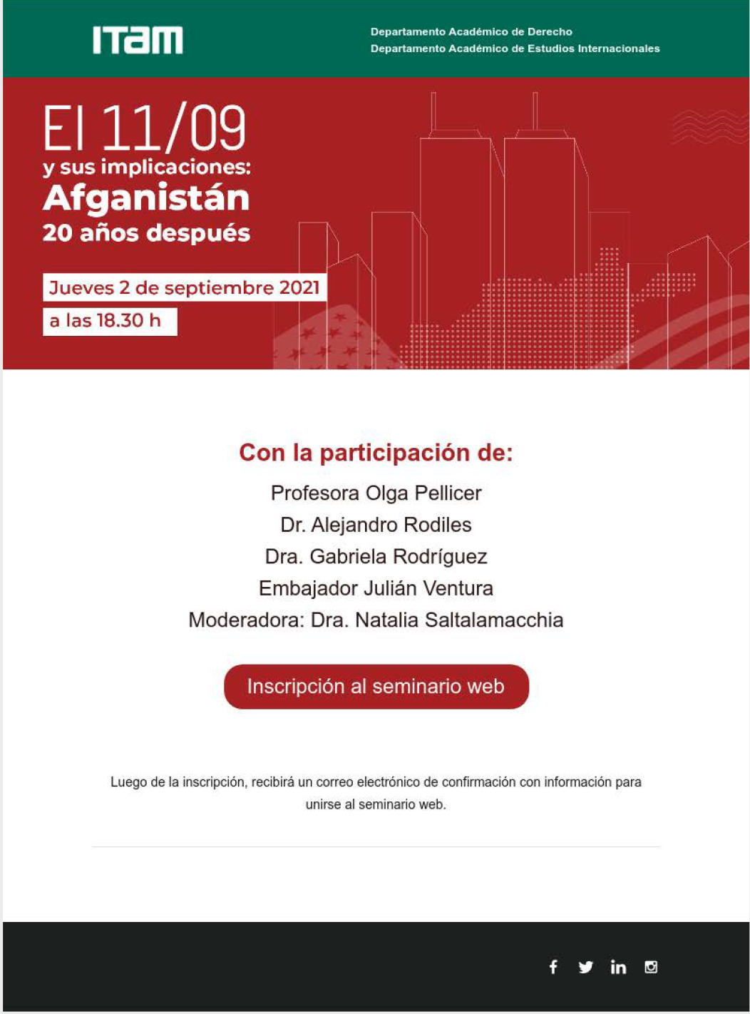 El Departamento Académico de Derecho y el Departamento Académico de Estudios Internacionales se complacen en invitarlos al webinar "El 11/09 y sus implicaciones: Afganistán 20 años después".