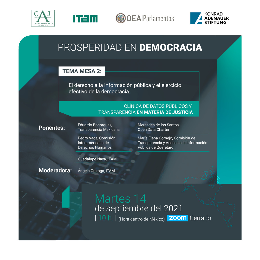 Como parte de las actividades organizadas con motivo del 20º Aniversario de la Carta Democrática Interamericana (CDI), la Fundación Konrad Adenauer (KAS), la Secretaría General de la Organización de los Estados Americanos (OEA) y el Centro de Acceso a la Justicia (CAJ) del Instituto Tecnológico Autónomo de México (ITAM), tienen el gusto de invitarlos a la segunda mesa temática del proyecto colaborativo Prosperidad en Democracia “El derecho a la información pública y el ejercicio efectivo de la democracia”, que se llevará a cabo el martes 14 de septiembre a las 10:00 hrs.