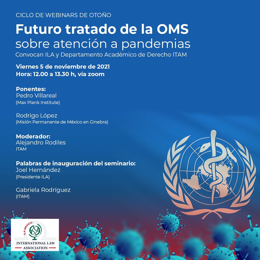 Nos complace invitarlos al ciclo de webinars organizado por la International Law Association (ILA) y el Departamento Académico de Derecho del ITAM, en el que se expondrán diversos temas durante el mes noviembre. El primer webinar es Futuro Tratado de la OMS sobre Atención a Pandemias, el cual se llevará a cabo el 5 de noviembre de 12:00 a 13:30 hrs.